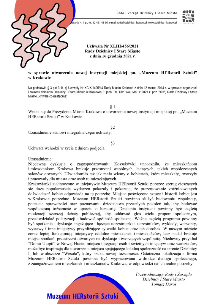 Koniec roku 2021 przyniósł nam powody do świętowania! Rada Dzielnicy I Stare Miasto przegłosowała uchwałę w sprawie utworzenia nowej instytucji miejskiej pn. „Muzeum HERstorii Sztuki” w Krakowie. Uchwałę opublikowano na początku tego roku, więc nareszcie możemy podzielić się z Wami tą wspaniałą wiadomością.